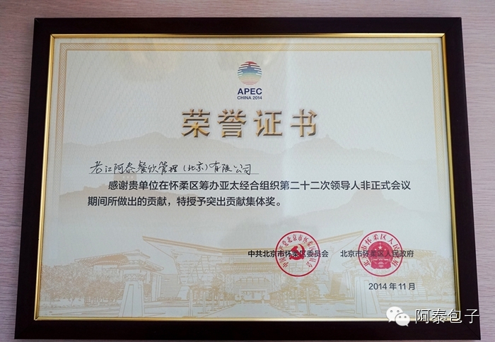 阿泰餐饮荣获怀柔区筹办亚太经合组织第二十二次领导人非正式会议突出贡献集体奖! 2014年亚太经合组织领导人会议继2001年在上海举办后重回中国,于11月5日至11日在北京怀柔雁栖湖召开。 阿泰餐饮作为怀柔区的明星企业,积极配合怀柔区政府筹办亚太经合组织第二十二次领导人非正式会议期间所有活动。并于9月6日携旗下六大品牌在美丽的雁栖风情大道隆重举行‘喜迎APEC·商业展风采’企业文化汇演,助力怀柔发展,得到多方媒体关注并报道。 阿泰餐饮在高速发展的同时不忘企业社会责任,用良心打造安全的餐品,用诚挚服务、健康饮食为消费者提供完美用餐体验。阿泰餐饮将秉承发扬中华传统饮食文化的精神,致力于打造中国包子第一品牌! |